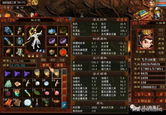 老规矩先上完整属性图。飞升166级男仙,加了950点敏捷。气血5.9万,法力17.9万,速度1659,抗混乱139,抗封印109,抗遗忘118,强力克火285,加强风80.8,忽视抗风50.7,风系狂暴几率80.2,风系狂暴程度40.6。既然是平民展示那肯定全身无仙器无神兵了。
