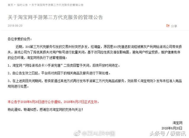今天,淘宝方面正式宣布关闭淘宝网的第三方手游充值选项,