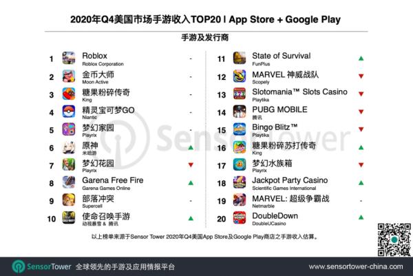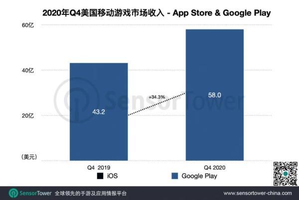 2月24日消息,Sensor Tower 发布的最新报告显示,2020 年 Q4 美国手游在 App Store 和 Google Play 的总收入超过 58 亿美元。