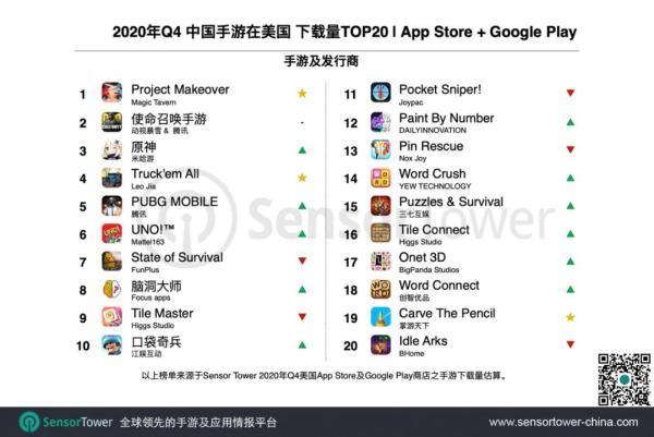Sensor Tower 表示,Q4 米哈游《原神》在美国 App Store 和 Google Play 吸金超过 1 亿美元,登顶国产手游收入榜。11 月中旬上市的 Magic Tavern《Project Makeover》以 2100 万美元跻身第 16 名。