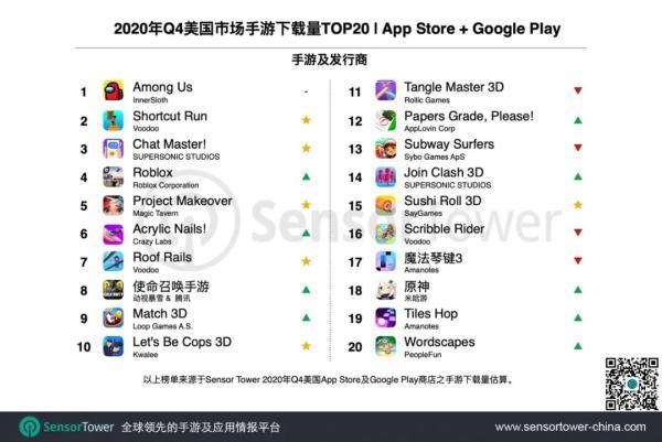 下载榜中,《Among Us》以超过2400万次下载蝉联榜首,是超休闲游戏《Shortcut Run》的3倍。尽管超休闲游戏以极快的换血速度统治着美区下载榜头部,但排名前100款超休闲游戏在美国App Store和Google Play全年总下载量为7.81亿,比2019年减少了12.3%。