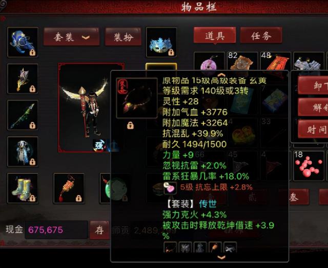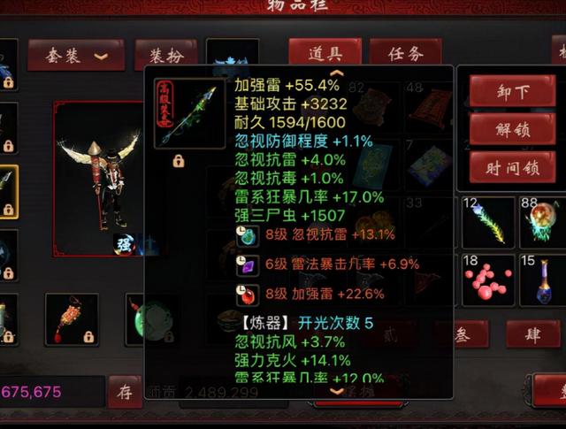 而在一心猜测这个男仙会不会是仙器炮时,他的武器亮相了,一件16级的高级装备,底子加强雷55.4、炼化上只有忽视抗雷、雷系狂暴几率两条属性,炼器上带克火14.1,雷系狂暴几率12。