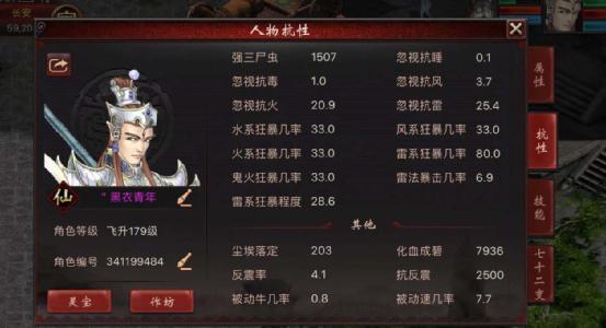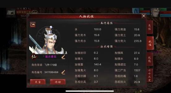 首先我们来了解一下这位男仙的属性,底子加强雷法140.4、人物属性水100、强力克火270,很显然,这是在传世容止套装下的结果,因为有了水魔附身的加持,所以本体水属性达到了满100的状态,克火也提高了100点。