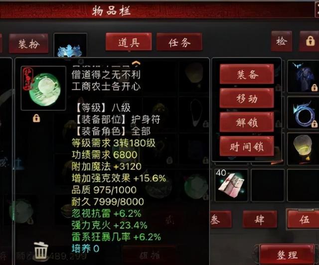 护身符是8级的“皎月东临”,底子增强克效果15.6、炼化忽视抗雷6.2、强力克火23.4、雷系狂暴几率6.2。