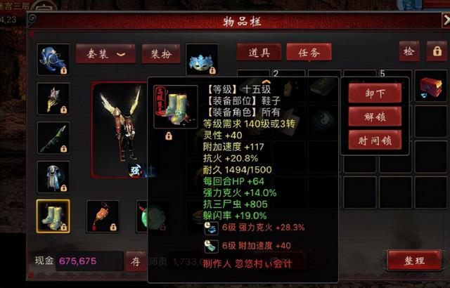 鞋子选用了一双15级的高装,底子加灵性40、炼化克火14。