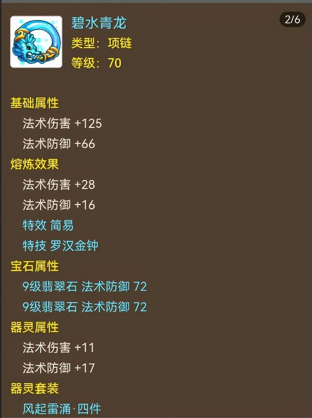 据该玩家所言,角色仓库就值4000W金币,而装备与宠物更是无法估量,这就让我们来仔细看看。项链是70级简易装备,属性已经近满值,同时带有罗汉金钟特技,完全就是毕业级的配置!而从镶嵌的风起雷涌器灵套装来看,这应该是物理门派玩家,不得不说确实豪华。