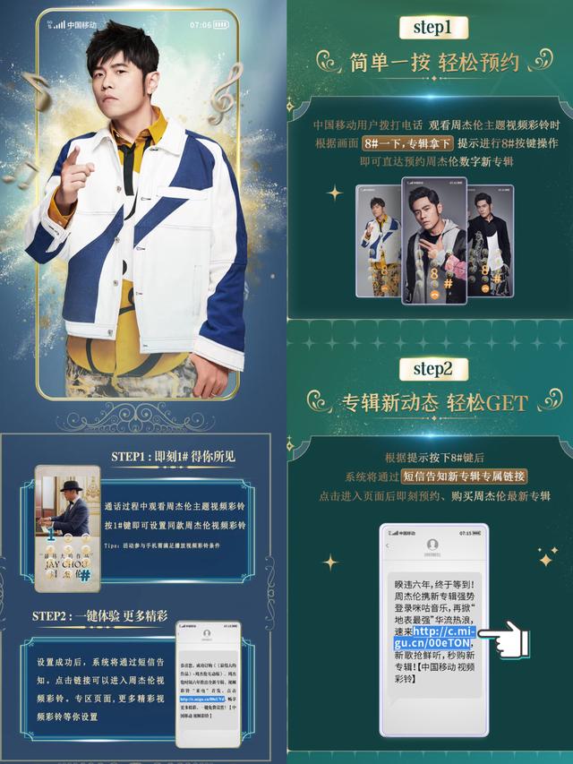 作为杰伦的“经典cp”——视频彩铃自然也花了不少“小心思”,为了方便歌迷随时随地Get偶像同款MV,特别设置了“1#、8#”互动玩法,在接通电话前,打开拨号键盘,就可以轻松设置同款,一键购买专辑。恨不得拿着大喇叭告诉全世界杰伦发新专的你,何不把视频彩铃安排上?用最潮流的方式应援周杰伦吧!