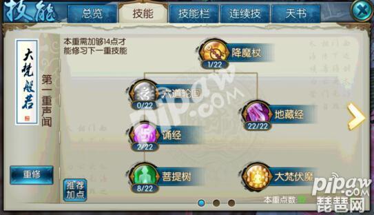 第一卷技能这个加点可能大家各有不同,争议可能就是在于菩提树和诵经的加点。个人建议放弃菩提树点诵经,为自己赢取加血的时间。