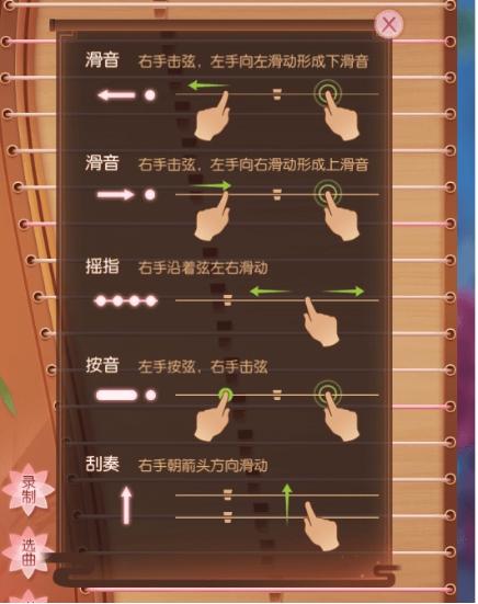 古筝内置了多种曲目,玩家可以自由选择,然后根据琴弦上显示的弹奏点,按顺序完成演奏。