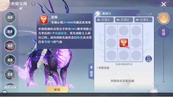 灵兽行动时有概率清除己方单位负面状态并恢复自身气血,是属于辅助型的坐骑技能,任何灵兽都可以选择使用。不过暗夜行的获取难度较高,目前仅有琳琅阁有极低概率刷出碎片,出场率非常低。