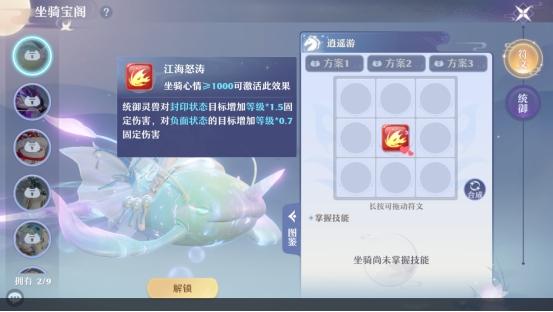 逍遥游在剑冢宝阁中可以使用剑玉兑换残魂,奇珍商人也有概率出现。坐骑技能可以让灵兽对封印和负面状态的目标增加固定伤害,对于封印和法系输出门派来说更为适用,各种灵兽都可以统御,但更推荐群攻灵兽使用,造成伤害收益会更高。