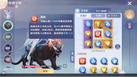 统御可以给予灵兽主动攻击时概率降低目标物防的效果,且技能与灵兽力点数相关。玄雷影获取难度也很低,只要使用武勋值兑换即可,是非常适合物理系灵兽选择的坐骑。