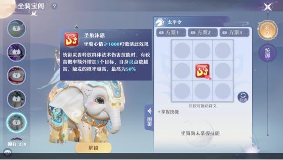 灵兽使用群攻法术技能时,高概率额外增加目标,且触发概率与灵兽灵点数相关。这个技能可以说是极为契合法术群攻类灵兽的,额外增加目标等于伤害提升了30%左右,搭配像饕餮这样可以吸血吸护盾的灵兽,无论是输出还是生存能力都大大提高。不过太平有象活动已经结束,暂无获取途径。