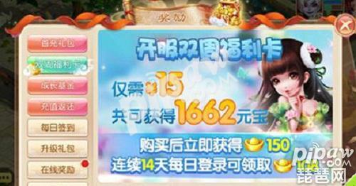 每日赠送:第一天立即赠送150元宝,后期13天每天赠送108元宝