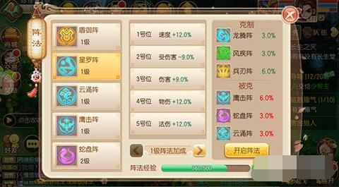 星罗阵也是个不错的选择,可以让圣巫的速度提高,保证先手效果,2号位受伤害-9%,可以上脆皮职业;3号位伤害+9%,随便一个输出职业即可;4号位物伤+12%,上合欢或者鬼王;5号位法伤+12%,上焚香或者青云。