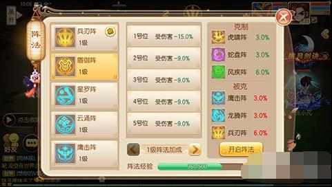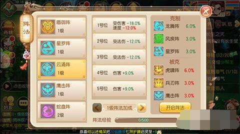 其次是云涌阵,可以让圣巫的受伤害-18%,2、3号位受法伤-12%,4、5号位伤害+9%,这样一来,可以让法伤脆皮的天音、合欢在2、3号位,其他输出职业在4、5号位。不过这个阵法会降低圣巫速度,影响先手封印。
