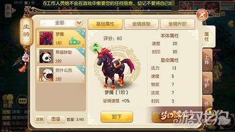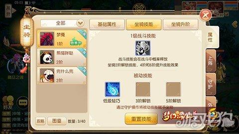 梦魇坐骑升阶可以解锁战斗技能[摄魂]:对敌方使用门派技能前,有概率增加技能的封印命中;至于被动技能则可对宠物进行守护,被守护的宠物则会附加技能增幅属性或技能加成(坐骑升阶可解锁更多守护技能)。