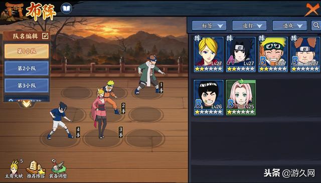 每场战斗我们只能上阵加上主角在内的四名忍者,而供我们站立的位置则有9格,站在更靠上靠前的忍者,出手的优先级更高,相应的受到攻击的概率也越大。所以我们需要将提供连招第一环节的忍者以及抗击打能力更强的忍者放到先手位也就是靠前的位置。