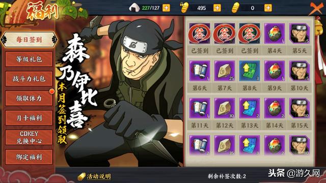 完成难度最小的活动要属每个月都有的签到奖励了!这个月可以领取的忍者是中忍第一关的考官森乃伊比喜,只要你坚持每天登录,不用一个月就能用赠送的碎片合成他了!简直是A级忍者,“点击就送”啊!不知道下个月的活动奖励会换成谁呢?