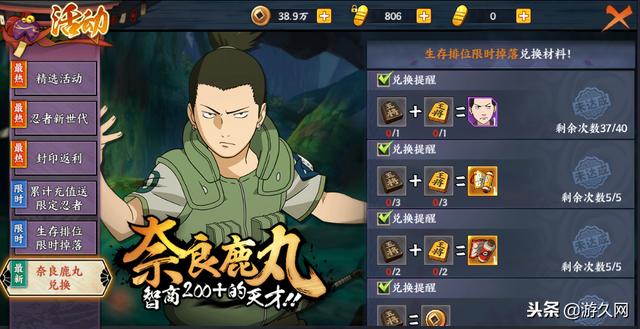 游戏中首次通关副本会送你封印碎片,通过积攒封印碎片就可以进行十连招募,这是我们第一次离高级忍者如此之近!第一次十连抽中最好的忍者应该就是鹿丸了——他可是前期唯一带有控制效果的忍者!即使没有抽到也没关系,游戏里现在有“奈良鹿丸兑换”活动,参与生存探险和排位赛玩法就能获得道具以换取鹿丸碎片。