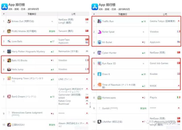 2018年5月(左)和2019年5月日本iOS手游免费榜对比