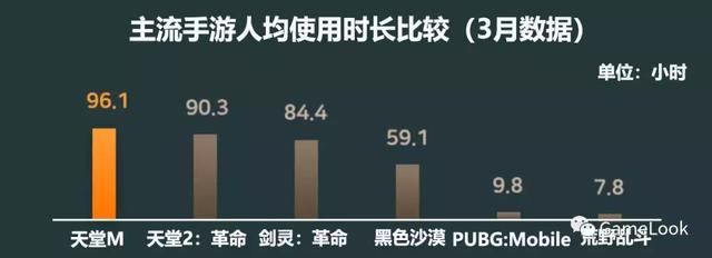在主流手游中,《天堂M》的3月人均使用时长最高,达到了96.1个小时,非常重度