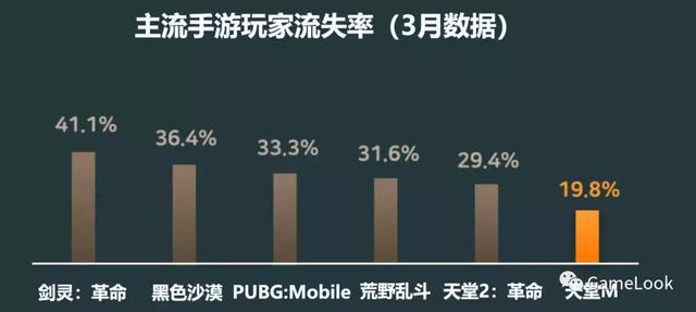 而玩家流失率方面,《天堂M》也最低,仅为19.8%。最高的是《剑灵:革命》,达到了41.1%。