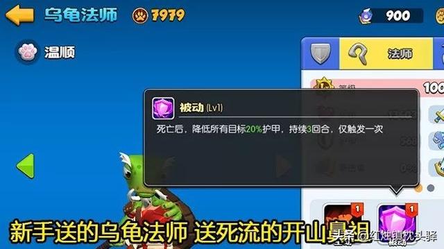 例如很容易玩家被忽略的一张卡:新手时赠送玩家的乌龟法师,它的被动技能是“死亡后降低所有目标20%护甲”,这就是前期推图的一大利器!