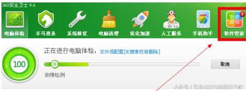 2、打开360安全卫士,如果没有安装这个软件件,就到网上下载一个。然后选择“软件管家”。