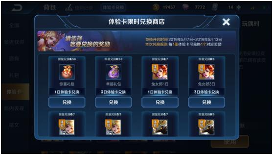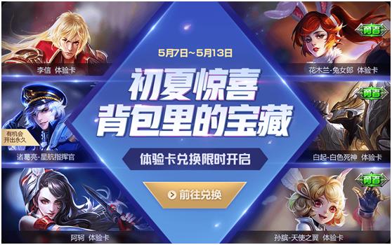 5月7日~5月13日,王者荣耀背包里的宝藏又上架了,堆在召唤师们背包里的体验卡终于有用武之地了,此次限时兑换的商店中上架的英雄有鬼谷子,猪八戒,李信,成吉思汗,阿轲和干将莫邪,都是13888金币和18888金币的英雄,想尝试这些英雄的召唤师们可以先兑换体验卡去练练手,免得到时候买了英雄又放仓库。