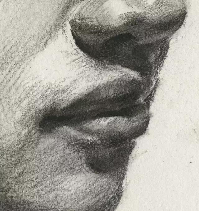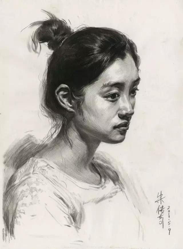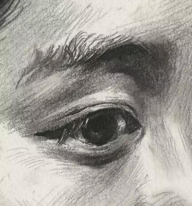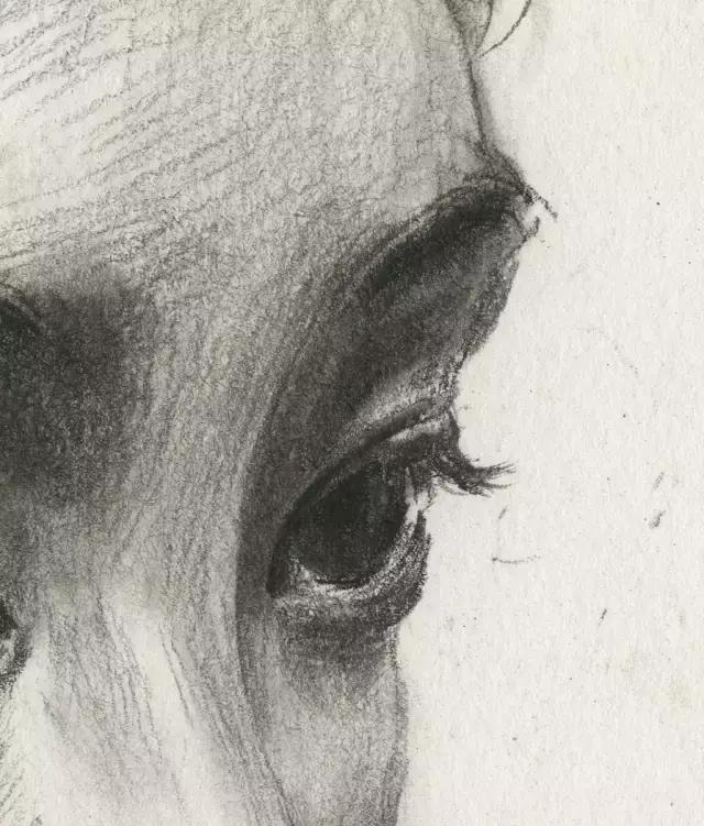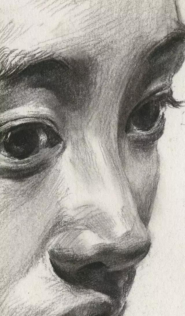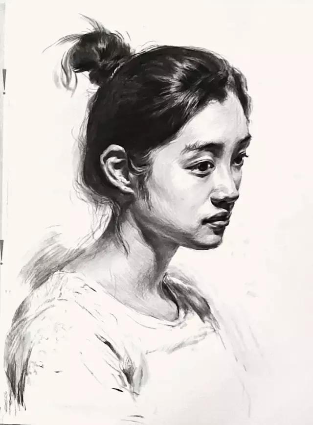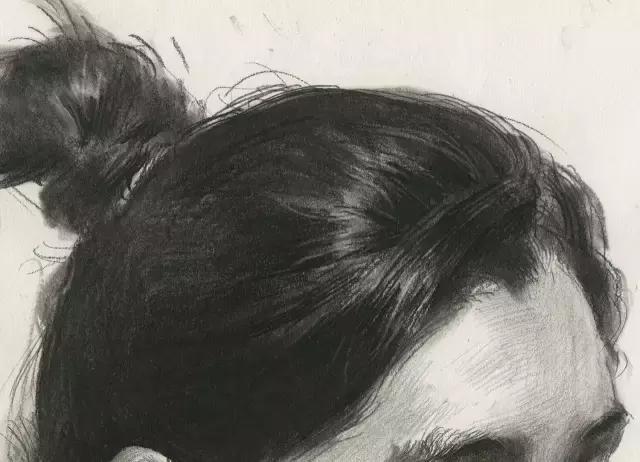 3、头发随着塑造的深入,也将重度压重,这样能保证画面黑白灰关系的拉开,更高的对比度有助于更强画面表现力。注意头发边缘处那些飞扬的发丝,要有一些虚实的变化,从混沌的“虚”发团之中,延伸出一些“实”的,具体的发丝。女青年的头像中五官是绝对的重点,因为面部上需要表达的骨骼肌肉等内容很少,清润秀丽的人物就更需要五官的依托。五官的深入依然是要把该重的地方画重,加强对比度。要在画面的中心位置,是耳朵、鬓角、颧骨等位置,这些地方要刻画的更为深入,具体。保证画面的完整度,颈肩的位置也跟着做一些简练的刻画。