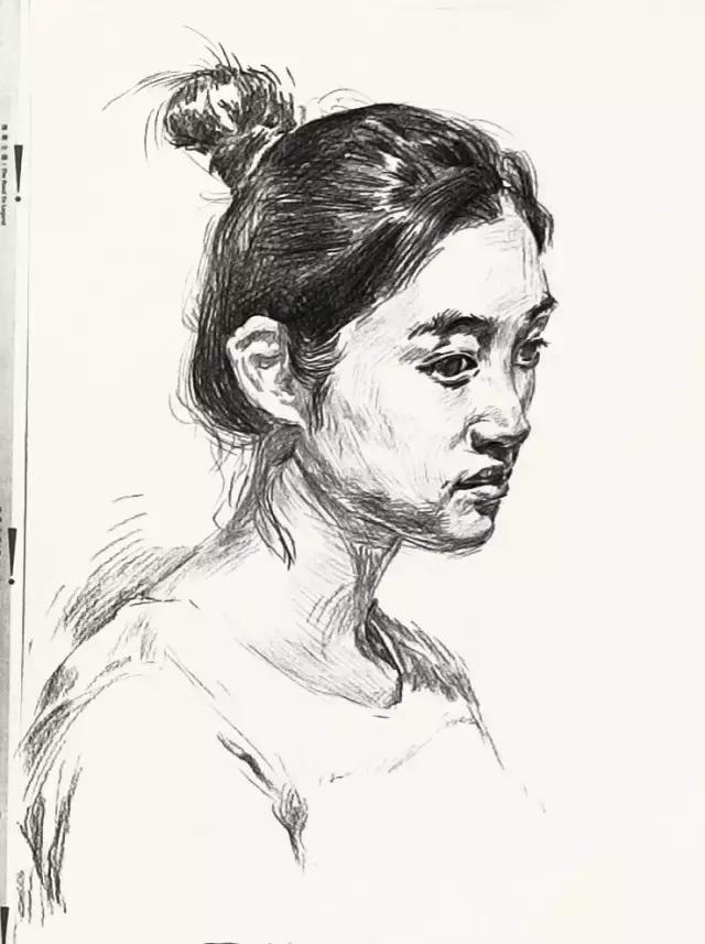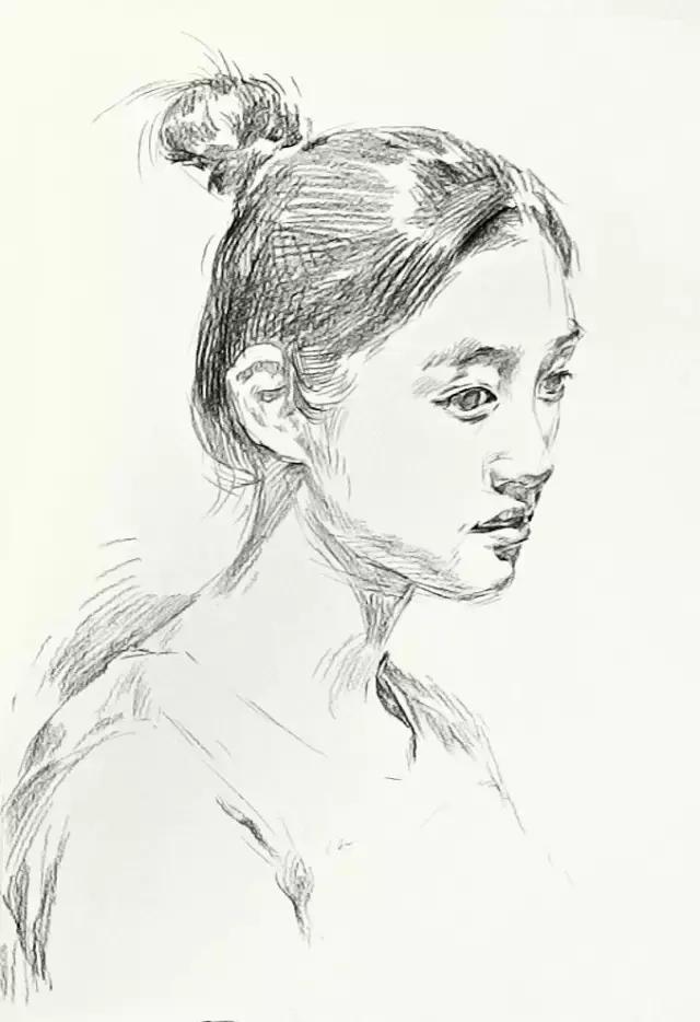 2、女青年的头像中,头发的特征表达是非常非常重要的,头发的状态也能表达出人物的特征甚至是有助于神情、性格等表达。观察头发的块面,笔触要顺着头发的走向,同时保证整个头部的体积塑造。面部中,面貌清秀的女青年,骨骼和肌肉的起伏变化不大但是非常微妙,在一些关键位置适当的带一些调子如颧骨、眼窝和下颚附近。下颚的厚度表现,表达头部体积的关键点之一,在相应的位置把块面表达出来。