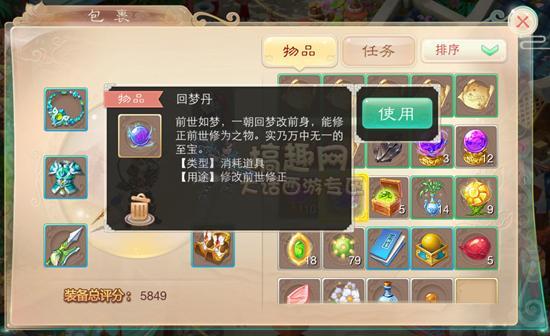 1、选择包裹里的回梦丹,点击使用;
