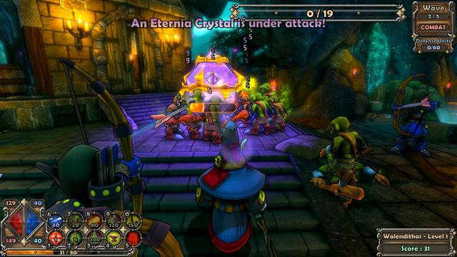 游戏中四面会有小怪涌过来,你需要保护中间脆弱的水晶。游戏中有几个时间段要好好把握,第一就是建筑时间,第二就是进攻时间。在建筑时间里你可以根据地形特点建造防御塔以及可以升级防御塔,或者是使用一些陷阱。也可以维修你的防御塔,或者设置防御的盾牌。这个设定来说还很少有游戏可以做到。在进攻时间里你仍然可以建造防御塔,但是很容易被打断,这个时候你可能会变得手忙脚乱,因为四面都有怪出现而且3D的场景会让部分玩家手足无措。敌人被打败会获得水晶,这水晶至关重要。修塔升级都靠它了。游戏人物是法师所以他的战斗方式是用法杖发射魔法飞弹,值得注意的是魔法飞弹发射时按住不放可以蓄力威力会更大。这些设定都非常的不错,但是玩家开始的时候需要熟悉熟悉。不然很容易就会忙到不行。