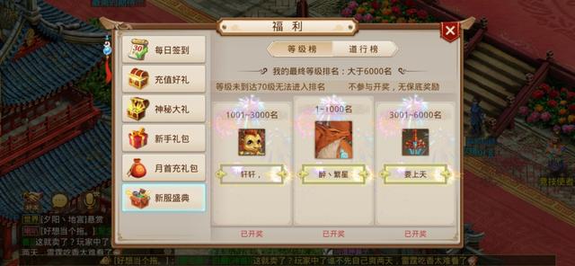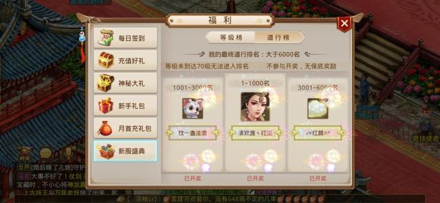 在等级榜或道行榜任意一个榜单排名前6000名,即可参与抽稀有大奖。在等级榜或道行榜两个榜单都排名6000名以外,则只能够获得初级等级盛典礼包、初级道行盛典礼包。等级榜和道行榜都排名前6000名,是不是可以有2次抽奖机会?是的哦,双榜都排名前6000名,就会有两次抽奖机会~但最多只能获得一份稀有大奖。也就是说,如果其中一个排行榜抽中大奖后,未中奖的另一个排行榜就只会发放对应名次的保底奖励礼包。如果双榜都未抽中大奖,也可以获得双榜对应名次的保底奖励礼包哦!