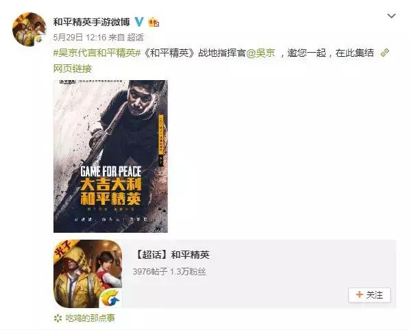 中国电影演员中最具代表性、票房成绩最好的吴京,配上手游里活跃度首屈一指的《和平精英》,可谓是"最强配最强",怪不得网友们一片叫好。