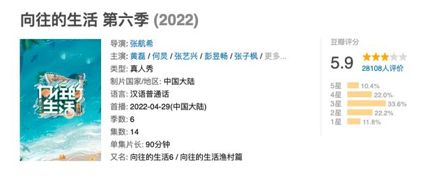 《向往的生活》第六季的豆瓣分首次跌破6分,只有5.9,反映出不少观众都开始审美疲劳,最初的新鲜感没了,向往的感觉也越来越少。