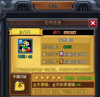 第二只“金闪闪”。额外增加金钱的,小编这只不是最顶尖的所以说增幅没有达到最大。最顶尖的话和“小火球”是一样的,增加18%。