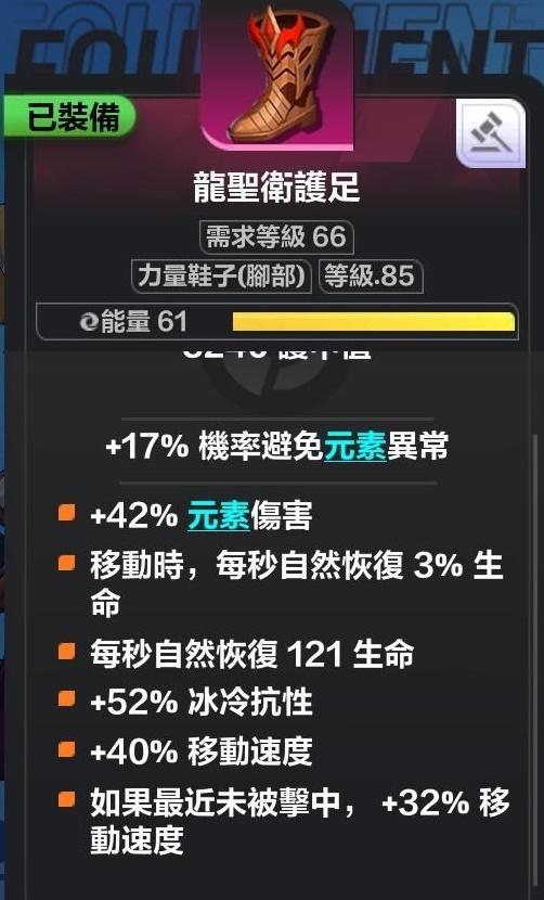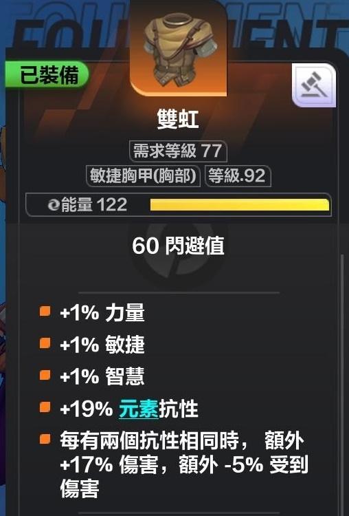 我现在用的是双虹这件传说装备,效果是元素三抗的相同的话超高的额外伤害跟减伤,但不是把抗性撑满就好了。