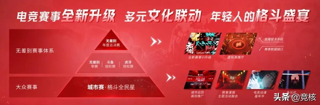 在年轻群体中,该作亦拥有不俗的号召力。官方数据显示,《火影忍者》手游年轻用户群体占比高达75%,日均PVP战斗超5000万场次,活跃参与率高达80%。 作为一款精品游戏,要想长线运营,必须得打破手游平均寿命3-6个月的“魔咒”。上线之初,《火影忍者》手游就不断补强游戏内容、增加游戏可玩性,打造配套的赛事以提高用户留存度。 聚焦至电竞赛事侧,手游联动赛事不可谓不紧密。官方推出的无差别格斗大赛,在格斗游戏爱好者之间具有极高的知名度,已成为移动格斗电竞的头部品牌赛事。 五年来,无差别赛事体系覆盖无差别季赛、斗鱼、虎牙平台授权赛,以及年度总决赛。赛事已累计覆盖超过1亿人次,超1500万参赛玩家以及超10亿累计观赛人次。