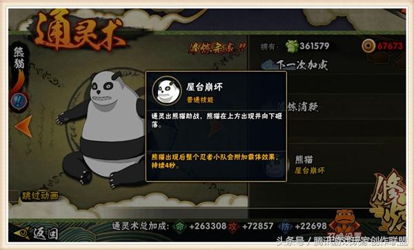 【常用通灵搭配】 熊猫:释放通灵出熊猫助战,熊猫在上方出现并向下砸落,熊猫出现后整个忍者小队会附加霸体效果,持续4秒。 98元的直购通灵兽,强度完爆与同价的螃蟹和变色龙,性价比极高。附带的四秒霸体效果超级适合纲手。可以说是高端局的必备通灵兽。