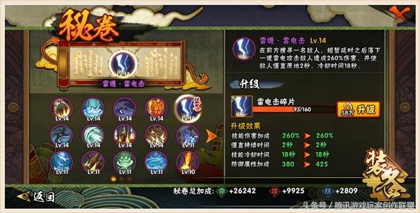 【雷遁·雷电击】在前方范围搜寻一名敌人,短暂延时后落下一道雷电攻击敌人并造成伤害,并使敌人僵直原地2秒,冷却时间18秒。 带这个秘卷是为了增加纲手连招的容错率,也可以防止突进型忍者的进攻,起了保护作用。僵直两秒的效果也可以让纲手有了更好的输出能力与环境,使纲手可以接起后续的连招攻击。