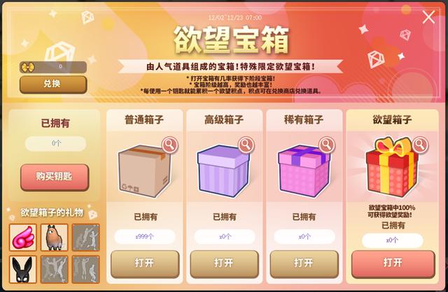 欲望宝箱活动中通过打开箱子获得的积点,可在兑换商店兑换各种道具。