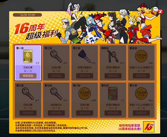 12月2日服务器维护后~12月16日7点活动以账号为单位进行。每日完成当前任务领取奖励,次日解锁次日任务,依此展开,总共又十日的任务。玩家需要完成当天的任务,才可解锁第二天的任务。活动期间每个任务只能完成一次。若当天的任务未完成,次日7点将会重置当前任务进度。*活动期间首次登录打开活动面板会获得16周年纪念头像!
