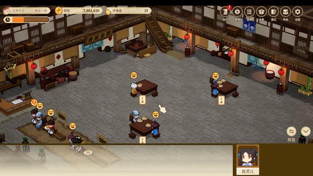 为啥说点击玩法呢,因为在开二周目激活掌柜之前,基本上它的主要玩法就是玩家设定一下伙计和菜单,然后在经营客栈的时候在客人身上点一下让客人上桌。