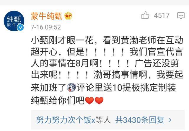 近日,张艺兴给黄渤送一百箱牛奶感谢哥哥让拥有3000万粉丝的知名演员黄渤为蒙牛免费做广告的事情瞬间刷屏,蒙牛官方也随即互动跟进,微博回应要免费送10提极挑定制装纯甄给参与评论的网友。