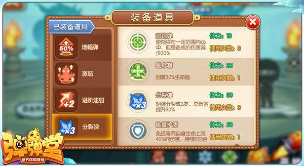 分裂弹:炮弹分裂成3发,总伤害提升30%,消耗体力:30点,使用次数:3