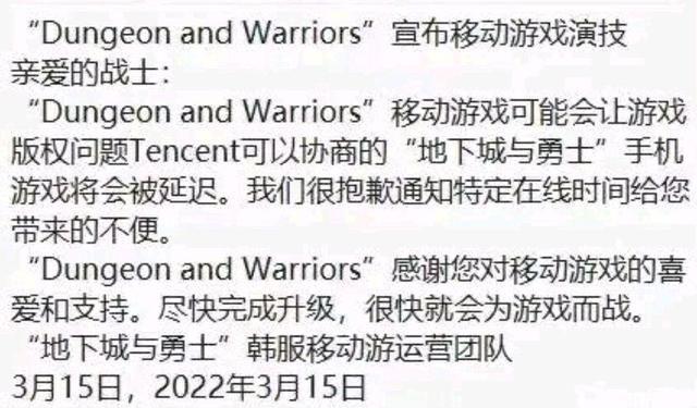 而下面的落款为“地下城与勇士”韩国移动端运营团队。