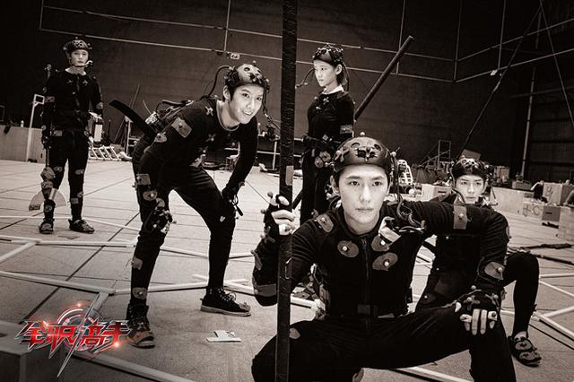 之后,还要将其与摄制棚内的真实人物、实物道具真实场景进行实时“匹配”,通过一定的技术处理,让演员能够用肢体驱动数字角色。“举例来说,当杨洋举起左手,他在剧中对应的游戏角色君莫笑也举起左手;当他拿起武器道具,君莫笑也拿起武器‘千机伞’。”