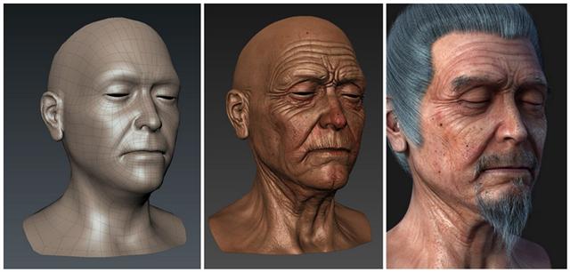 建模是创造三维人物的第一步,得益于数字雕刻等技术手段的进步,现在技术人员可以对模型进行更加细致的处理,增加皱纹等细节。接下来的贴图,为颜色、质地单一的“石膏像”模型增加肤色、肤质、毛发等细节,老者脸上的老年斑都清晰可见。早期三维动画毛发的塑造需要贴图假毛发,而现在,技术人员可以利用软件让人物“长”出一根根毛发,每一根都符合动力学特点,极具真实性。